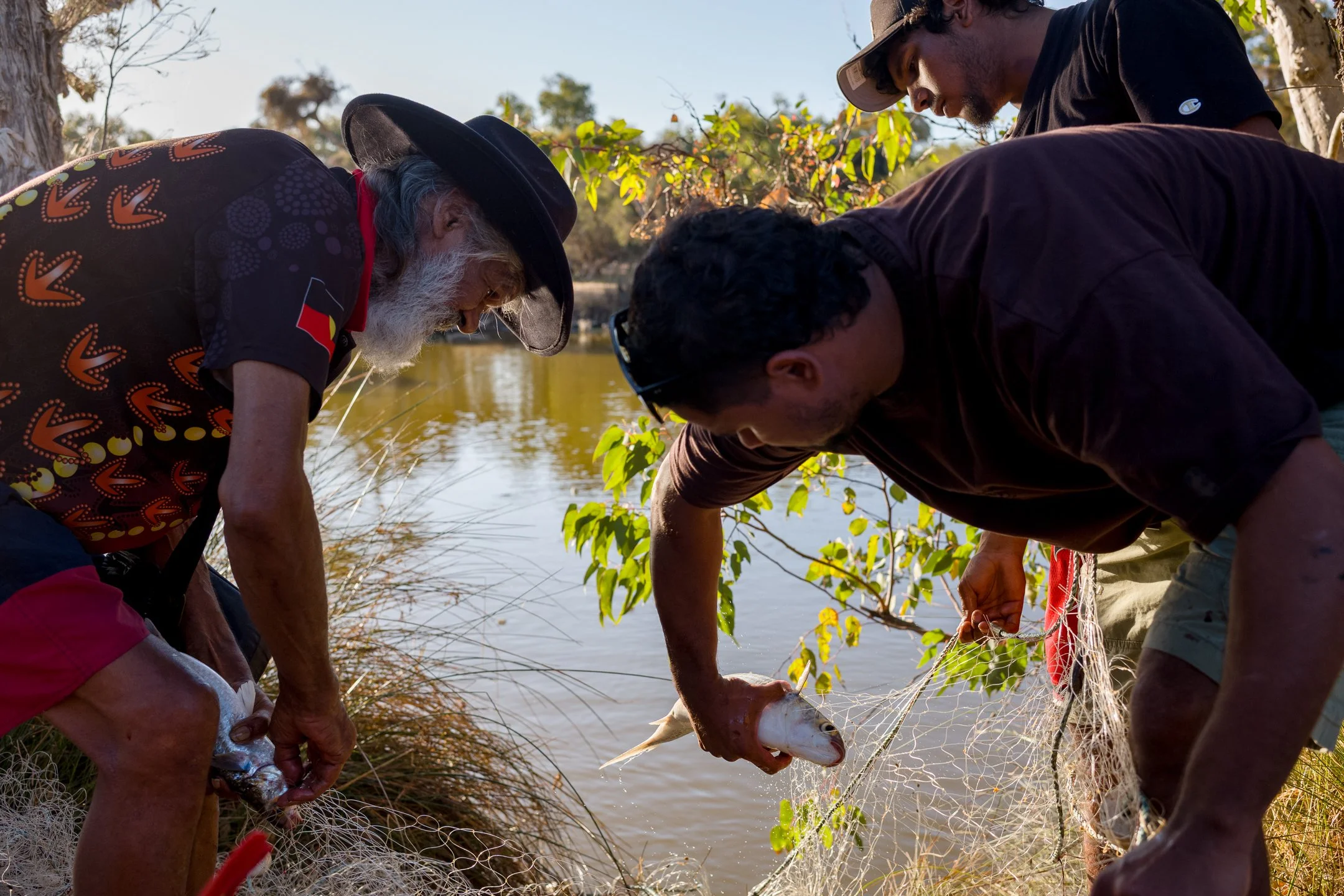 Franklin Nannup (left) and his nephew, Christopher Nannup (center), fish for mullet with relatives at a reserve on the outskirts of Alcoa’s mining lease, near Pinjarra, Western Australia, on March 24, 2025. “I’m going to be opposing [Alcoa’s planned expansion] all the time for the simple fact that there’s only one place in the world where the jarrah trees grow — and that’s my country,” said Franklin Nannup.