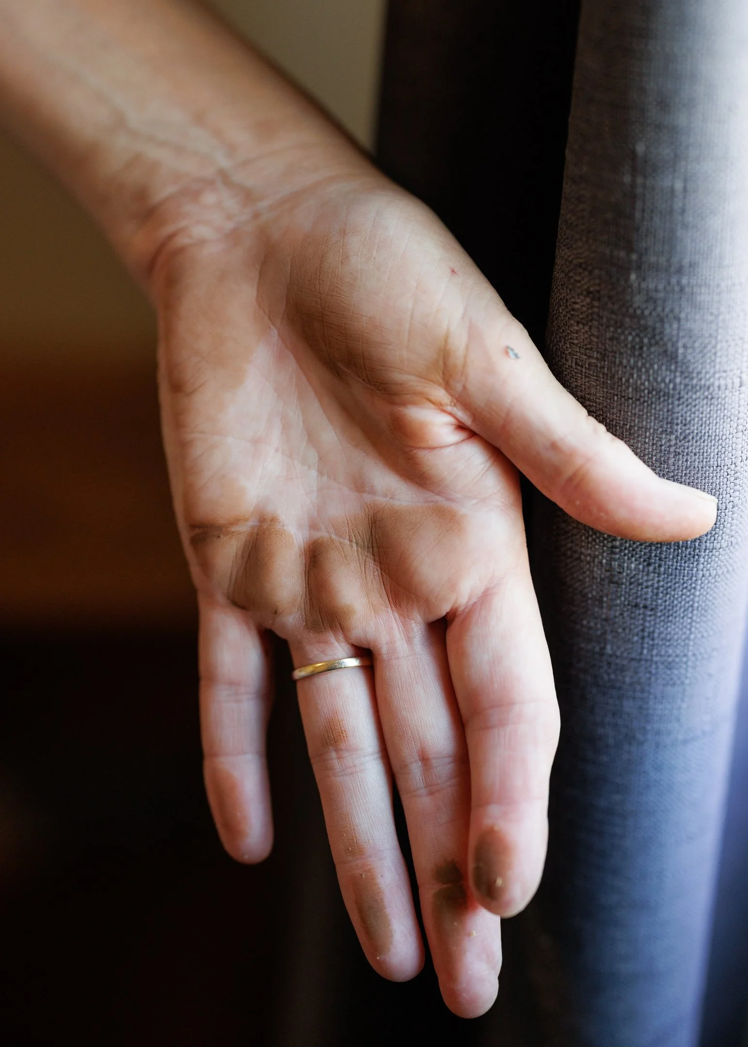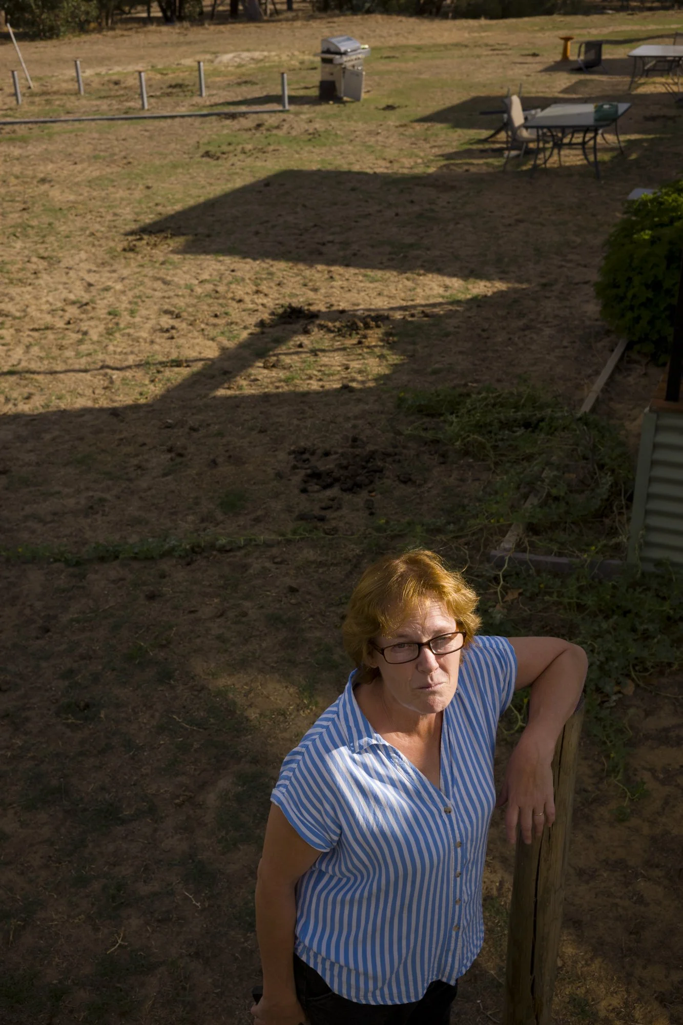 (Left) Collette Sheridan stands at the property where she lives with her husband, Richard, and which borders Alcoa’s residue lakes in Pinjarra on March 15, 2025. (Right) Collette Sheridan’s palm after cleaning dust in the chalets she and her husband built on the property on March 20, 2025.