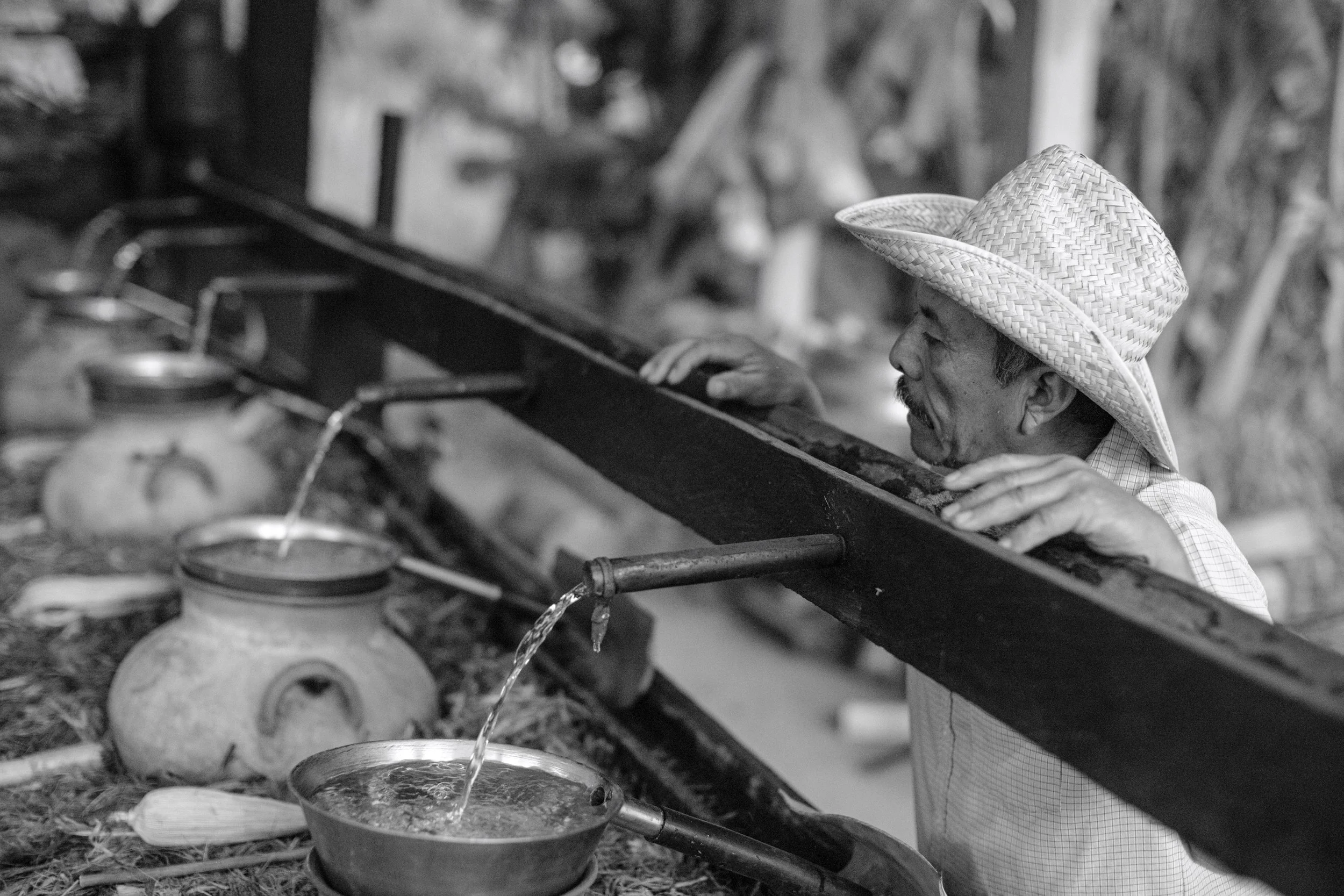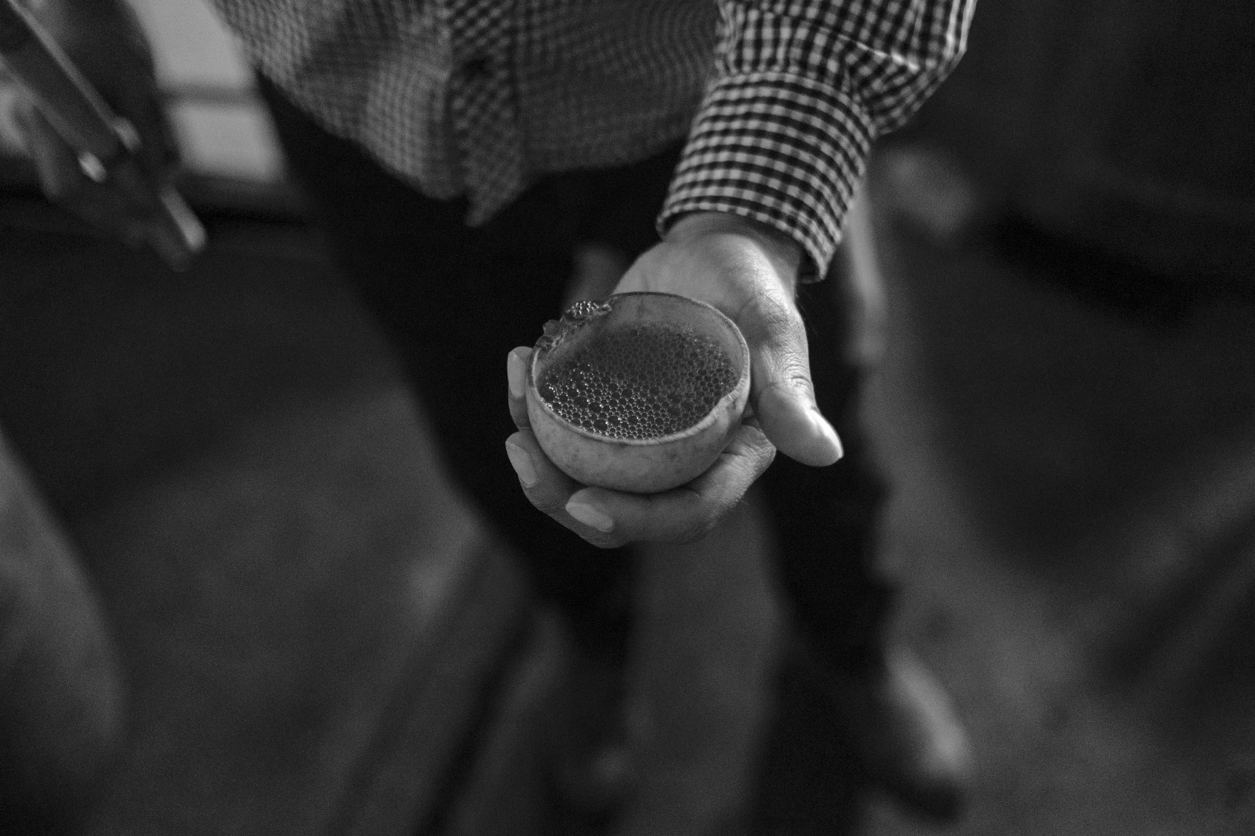 Maesto mezcalero Carlos Méndez Blas, owner of Del Buen Agave, holds a hollow gourd, or jícara ,containing aerated mezcal at his palenque in Santiago Matatlán, Oaxaca, Mexico on December 2, 2021. To determine the alcohol content of a batch of mezcal, maestro mezcaleros aerate the liquid by sucking it into a hollow reed and allowing it to drain into a jícara. The maestro determines the alcohol content by observing the amount of time that the bubbles remain on the surface— the longer they remain, the higher the alcohol content of the mezcal.