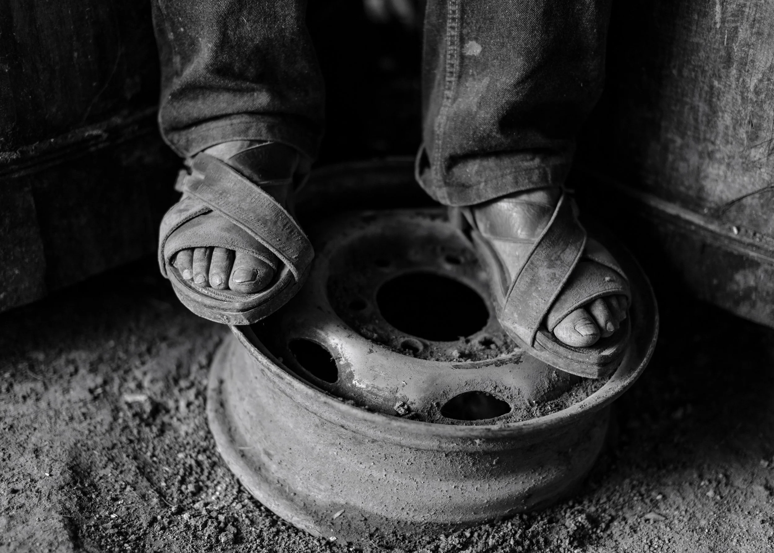 Maestro mezcalero Maximiliano “Serafín” García Gerónimo stands on a rusted wheel that he uses as a step stool at his palenque outside of San Dionisio Ocotopec, Oaxaca, Mexico on December 3, 2021.
