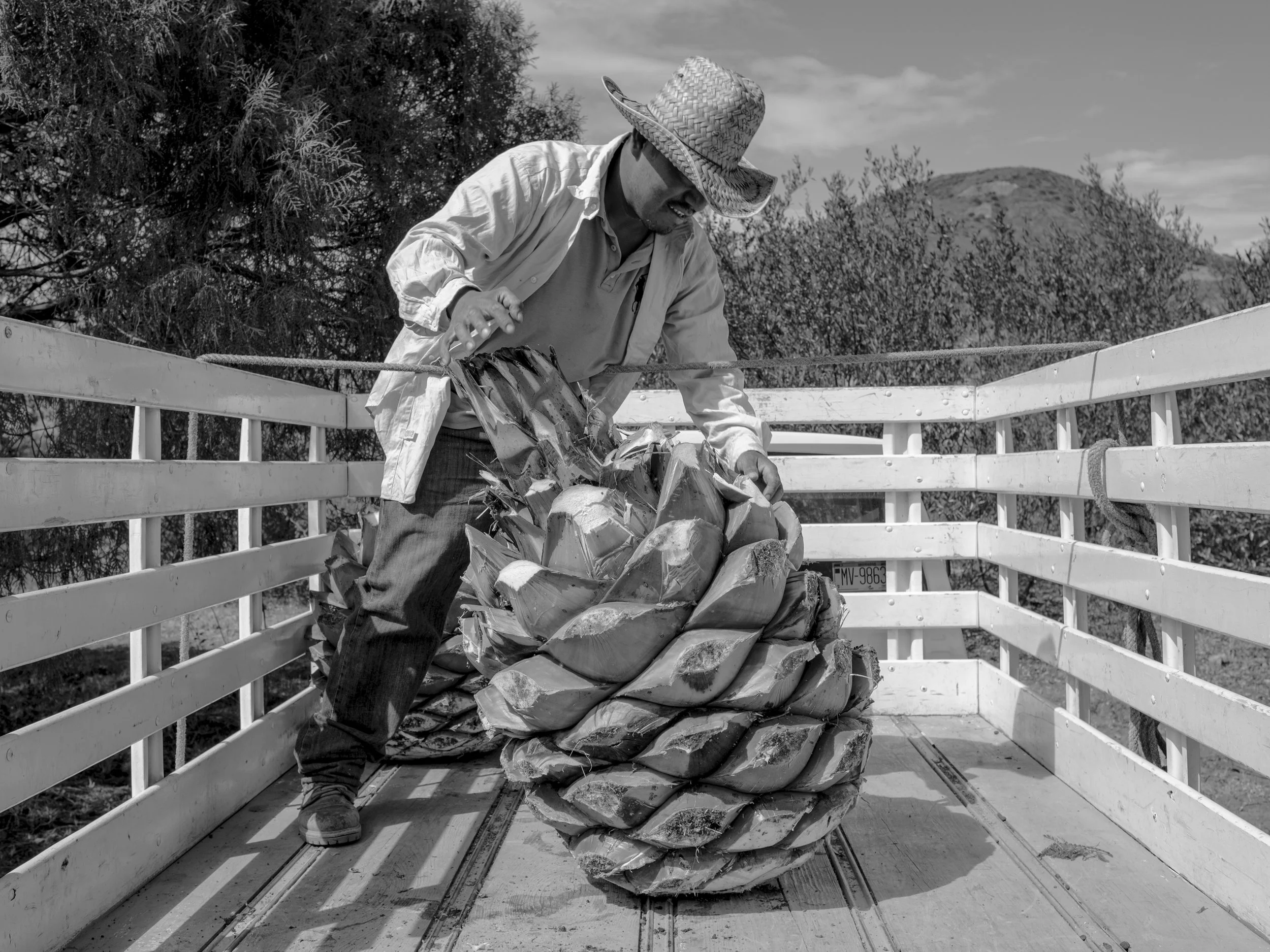 Manuel García moves a Piña into the back of his truck at the family’s agave fields outside of San Dionisio Ocotopec, Oaxaca, Mexico on December 15, 2021. Piñas are the heart of the agave and contain the sugars needed to make mezcal.