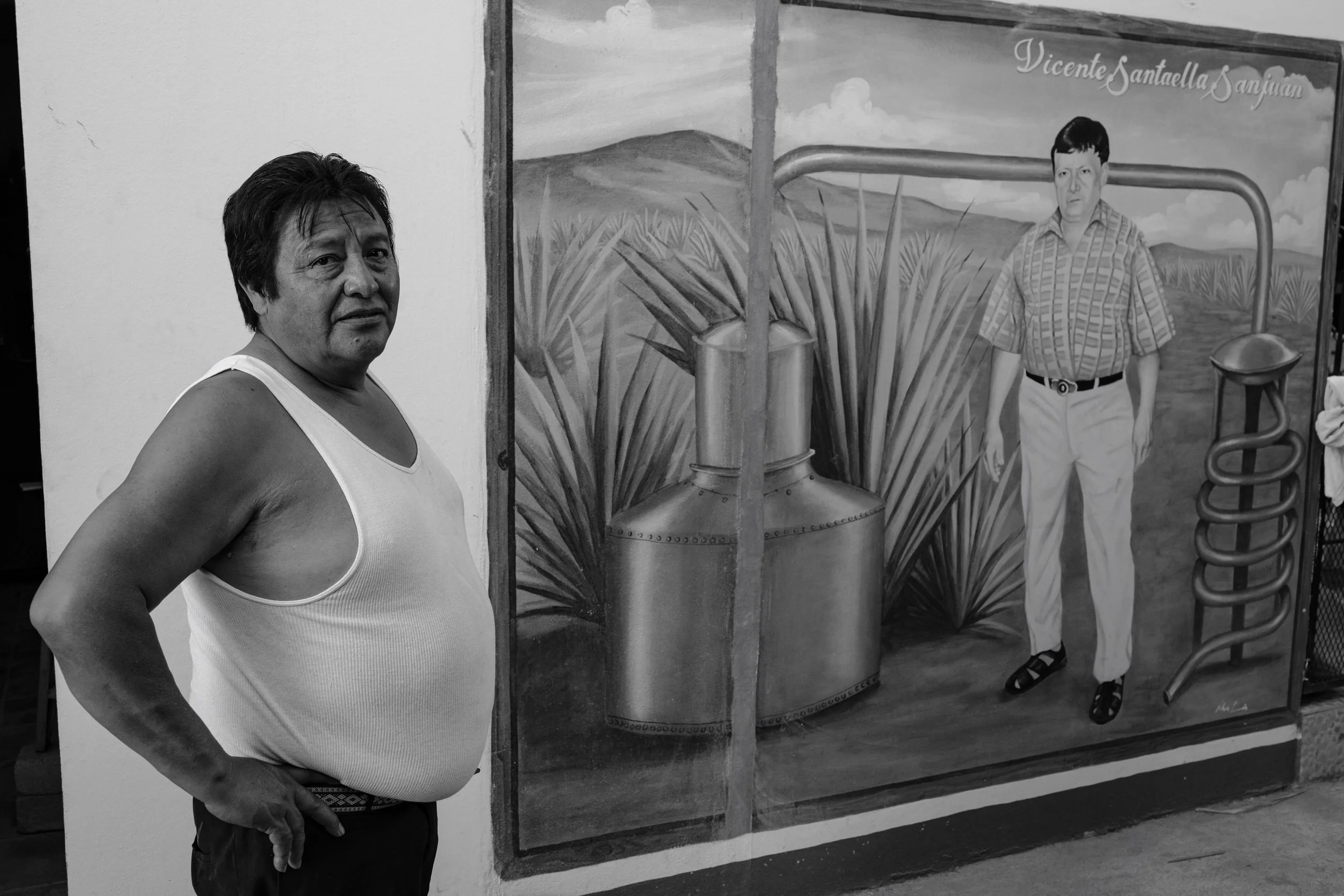 Manuel Santaella stands next to a mural of his grandfather who began the family business of building copper alambics by hand, which are used to distill fermented agave into mezcal, at his workshop in Ocotlán de Morelos, Oaxaca, Mexico on January 30th, 2022. According to Santaella, his business produces 80 percent of all copper products used to make Mezcal in the state of Oaxaca. Demand for his products has increased dramatically since before the COVID-19 pandemic, he says, with new brands regularly placing large orders as they set up production facilities in Oaxaca.
