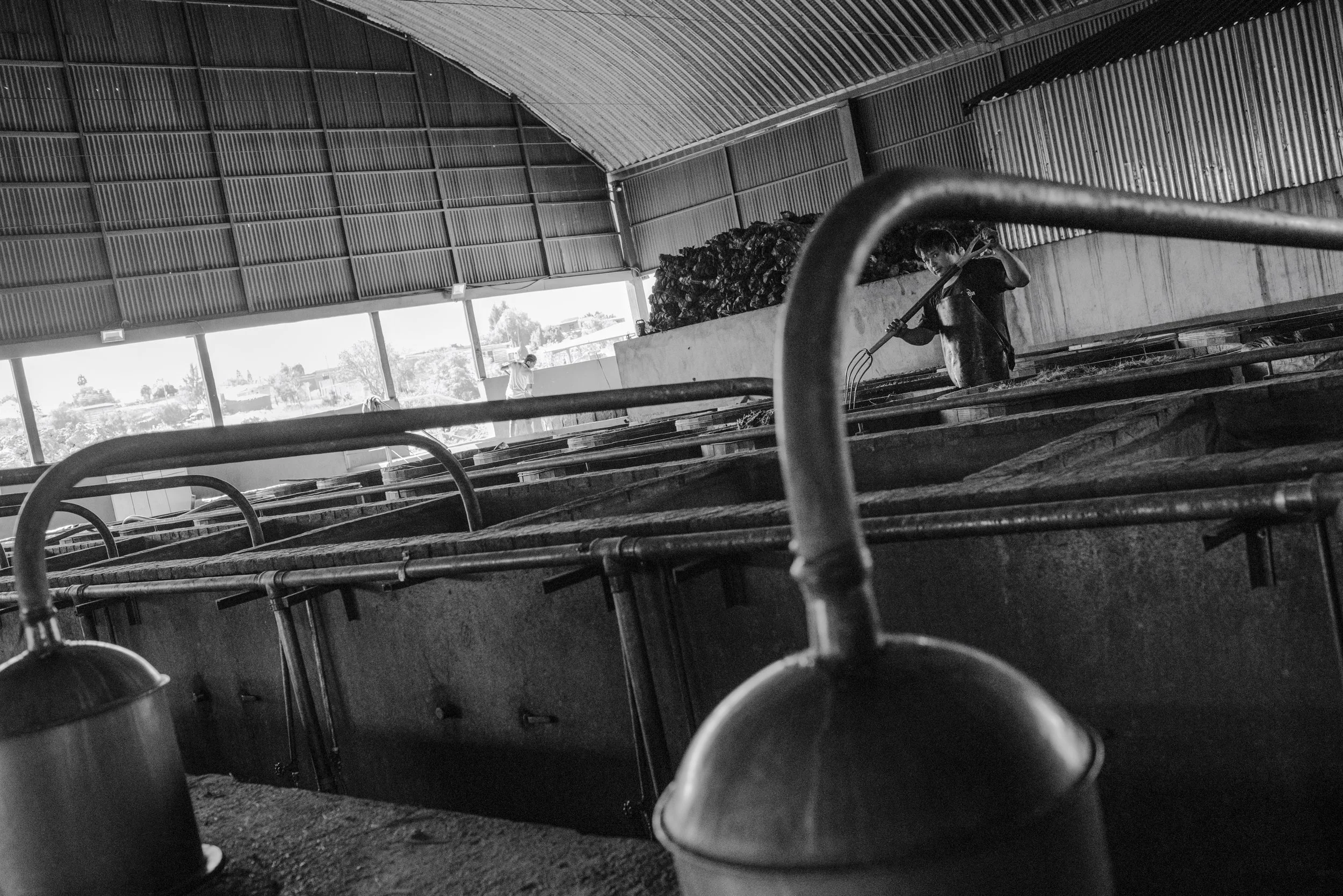 A worker tends to rows of tinas full of fermenting agave at an industrial-scale facility owned by Del Buen Agave in Santiago Matatlán, Oaxaca, Mexico, on December 2, 2021.